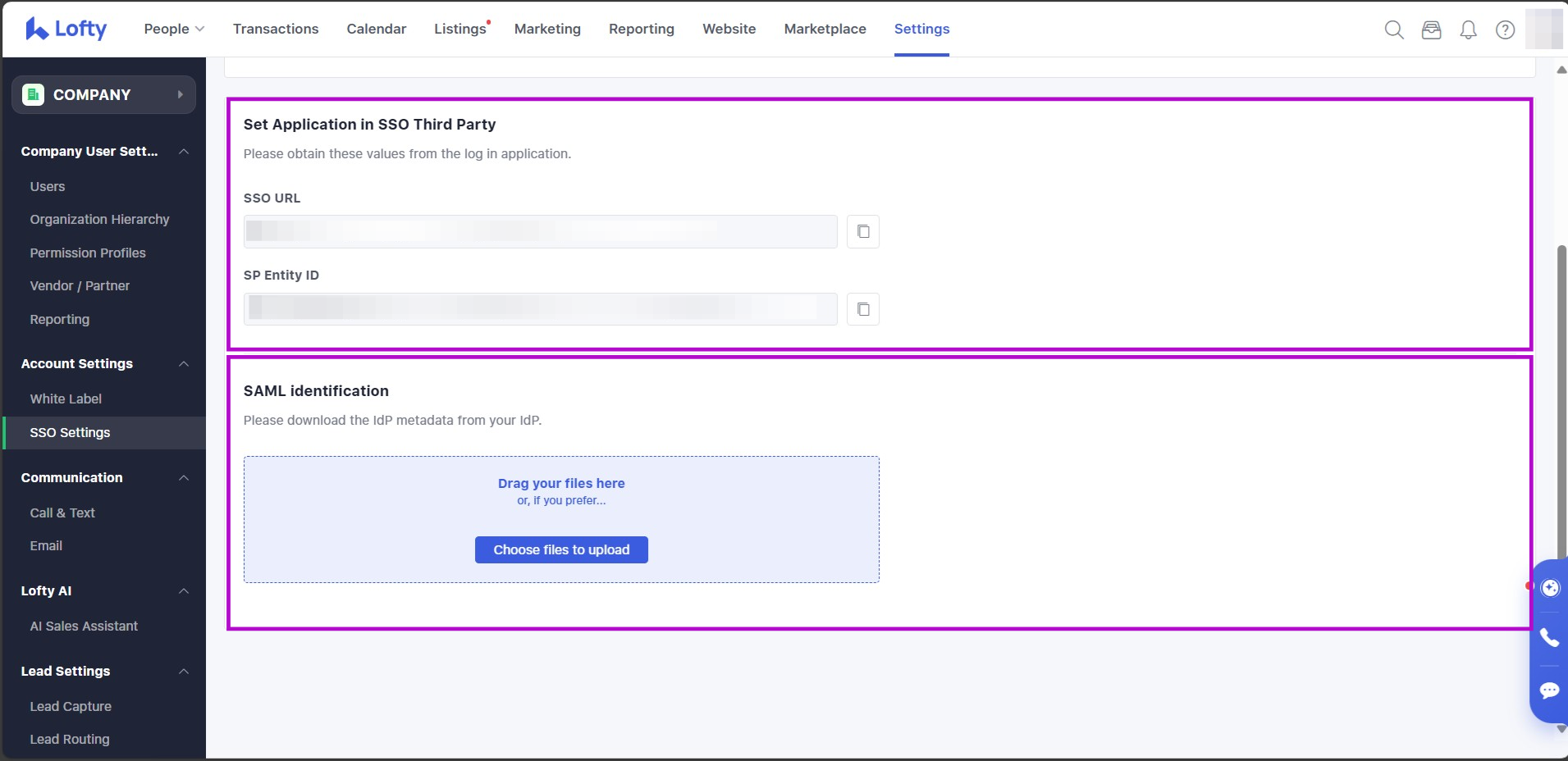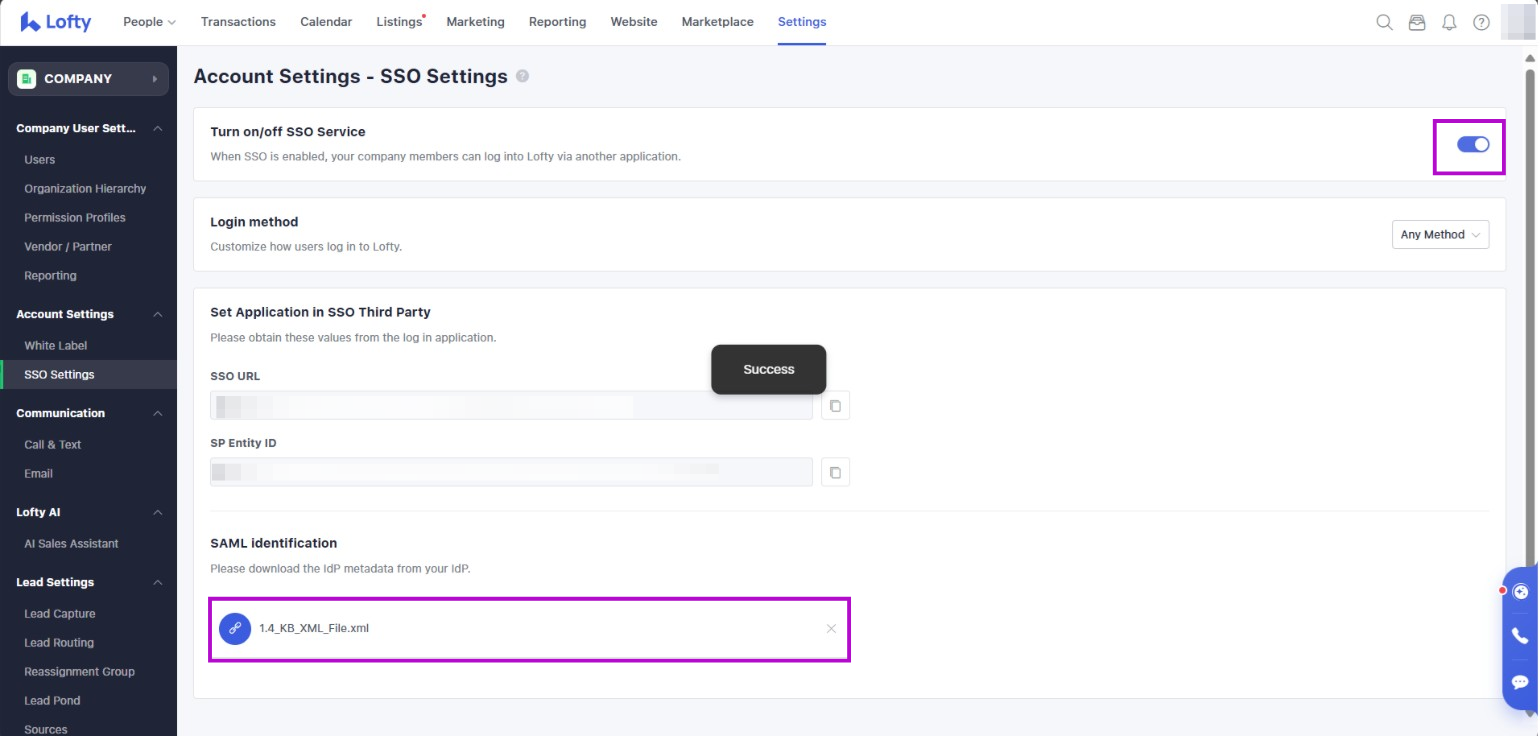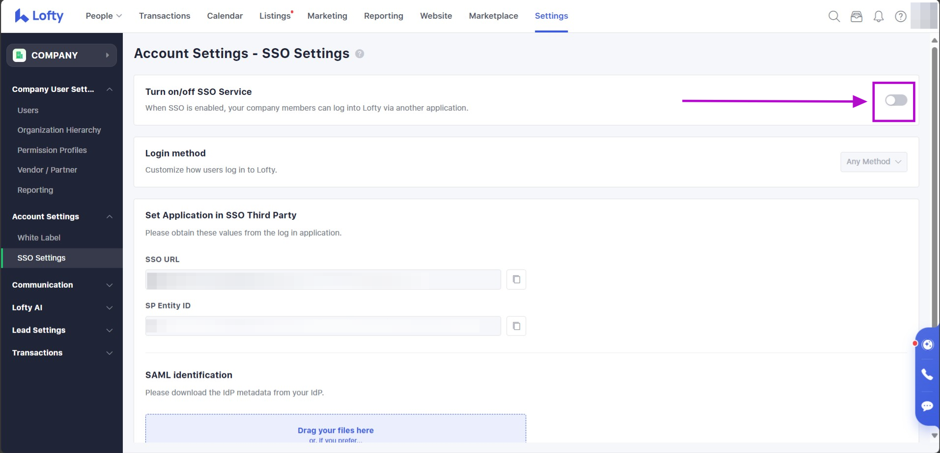 2. Upload SAML Metadata to Lofty and turn on the switch.