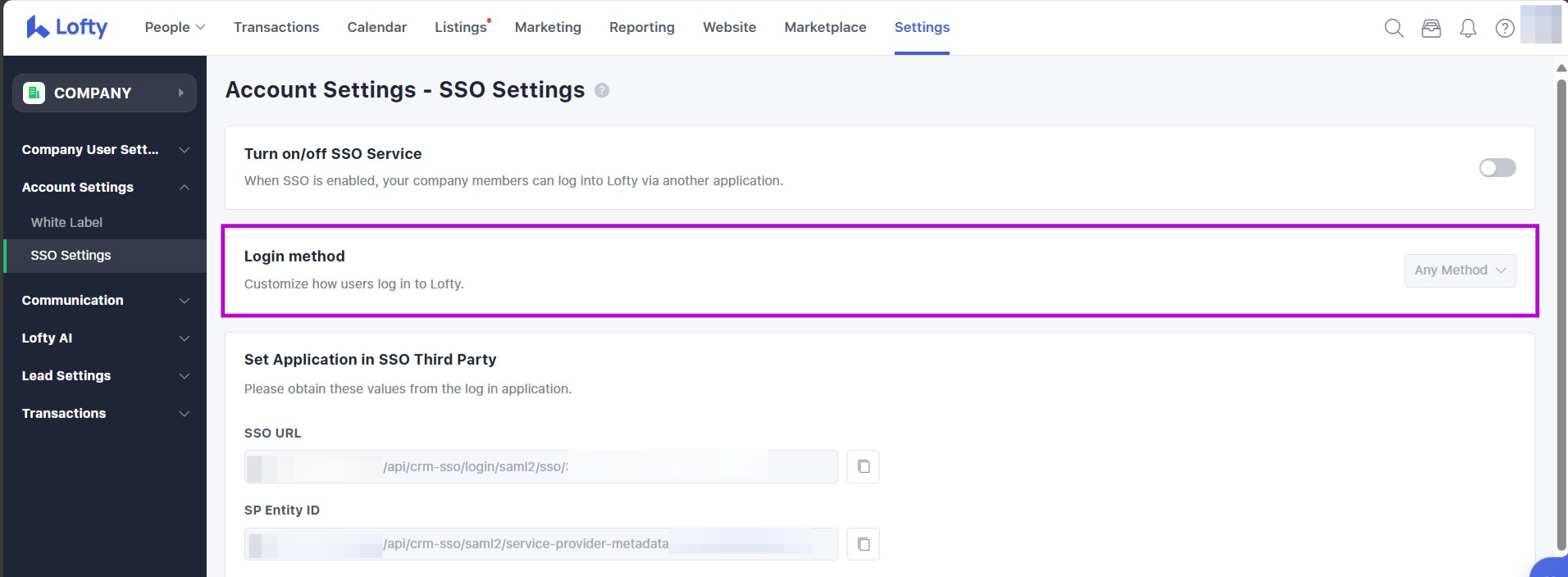 The login method setting provides an option that requires all Lofty users to sign in to their Lofty account, both on the website and mobile app, using Single Sign-On (SSO). By default, if you have already set up SSO for your Lofty account, the Login Method will be set to Any Method.