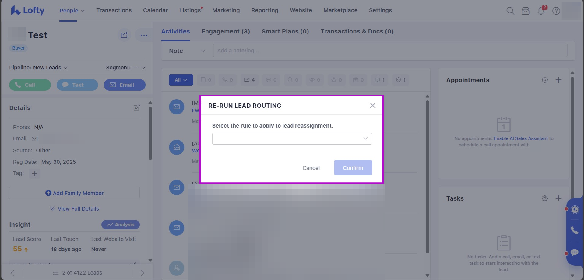 When selected, the agent can re-run lead routing, which will send the lead through the selected Group or Subgroup's lead routing rules.