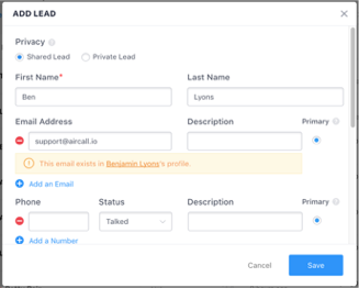 After clicking, a pop-up window will appear. A lead’s full name, lead role, and email will be populated if the information is available.