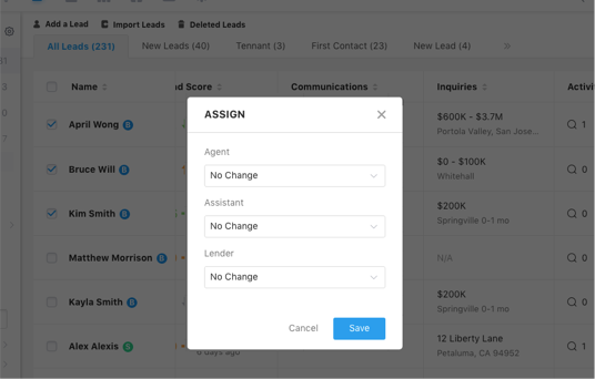 In this updated version, team members can assign another lender to their leads. This way, they can choose a lender they want to co-work with, and it’s time-saving for admin users. All users are able to mass assign leads to a lender in the People Listing Page.