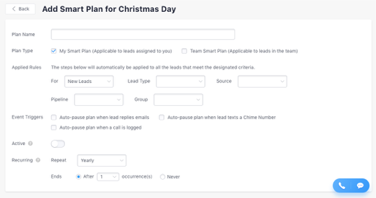 In this version, Smart Plans have been improved with recurring features. You are able to add a Smart Plan that triggers on New Year, Christmas, and Valentine’s Day with the option to set it to recur yearly. This way, the plan will automatically apply to specific leads every year on the date.