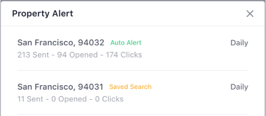 - Property alerts created by a lead’s saved searches will be shown along with the ones created by agents. They will be marked as ‘Saved Search’. Property alerts like this can not be edited but can be deleted (the lead’s saved search will remain).