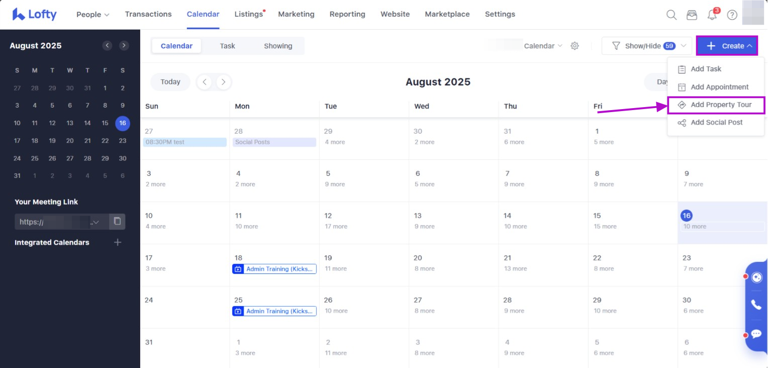 Navigate to the Lofty calendar, click + Create, and select Add Property Tour