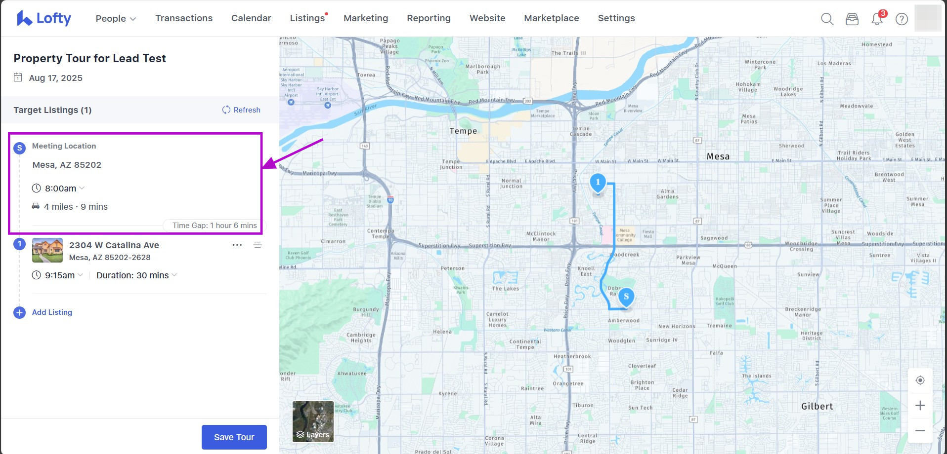 The Property Tour tool allows Lofty users to create listing showing itineraries for potential home buyers and renters. This tool allows you to set the meeting time and location, as well as all the homes on the tour, and calculates the estimated travel time between each stop. If the lead has created a profile on your Lofty website, they are able to view the tour itinerary there and leave feedback for all of the homes they tour.