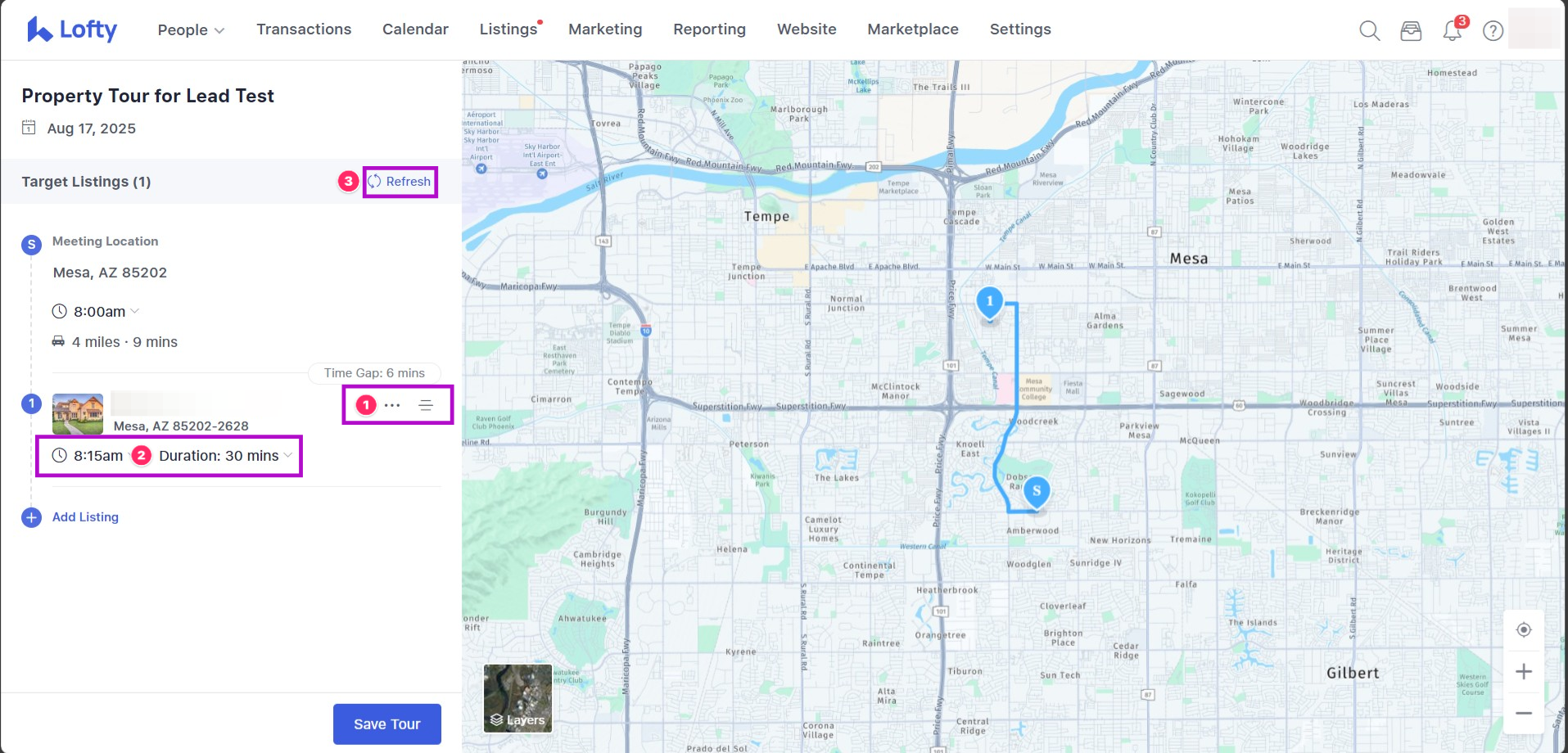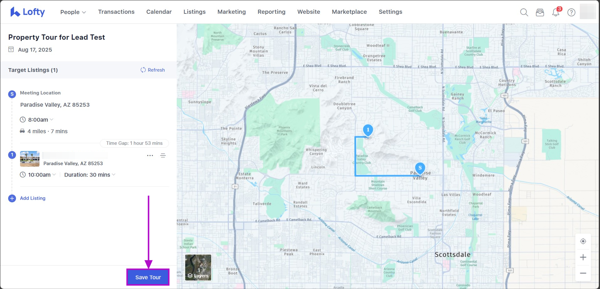 By default, the tour will begin at 8 AM the following day. The tour will be added to your Lofty calendar, so please remember to schedule the correct time and date. The default time spent at each listing is 30 minutes, but can be as long as 2 hours. The tour will fail to generate if there are more than 10 listings on the tour and if the tour lasts longer than 24 hours.