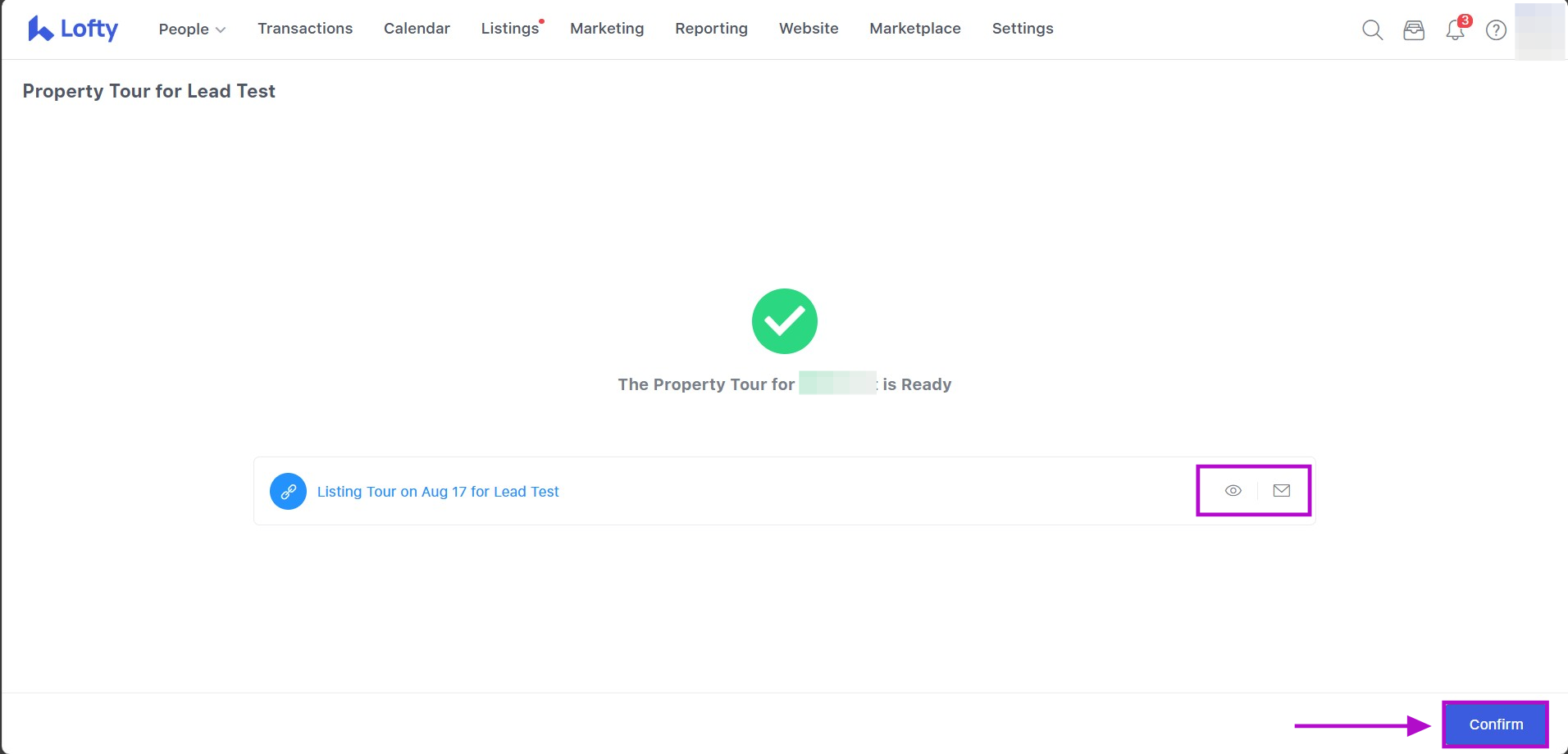 Once the tour has been saved, you have the option to view the tour and email the tour to the lead. When sending the email, the template is pre-written and can be edited before sending. Be sure to click Confirm to save the tour.