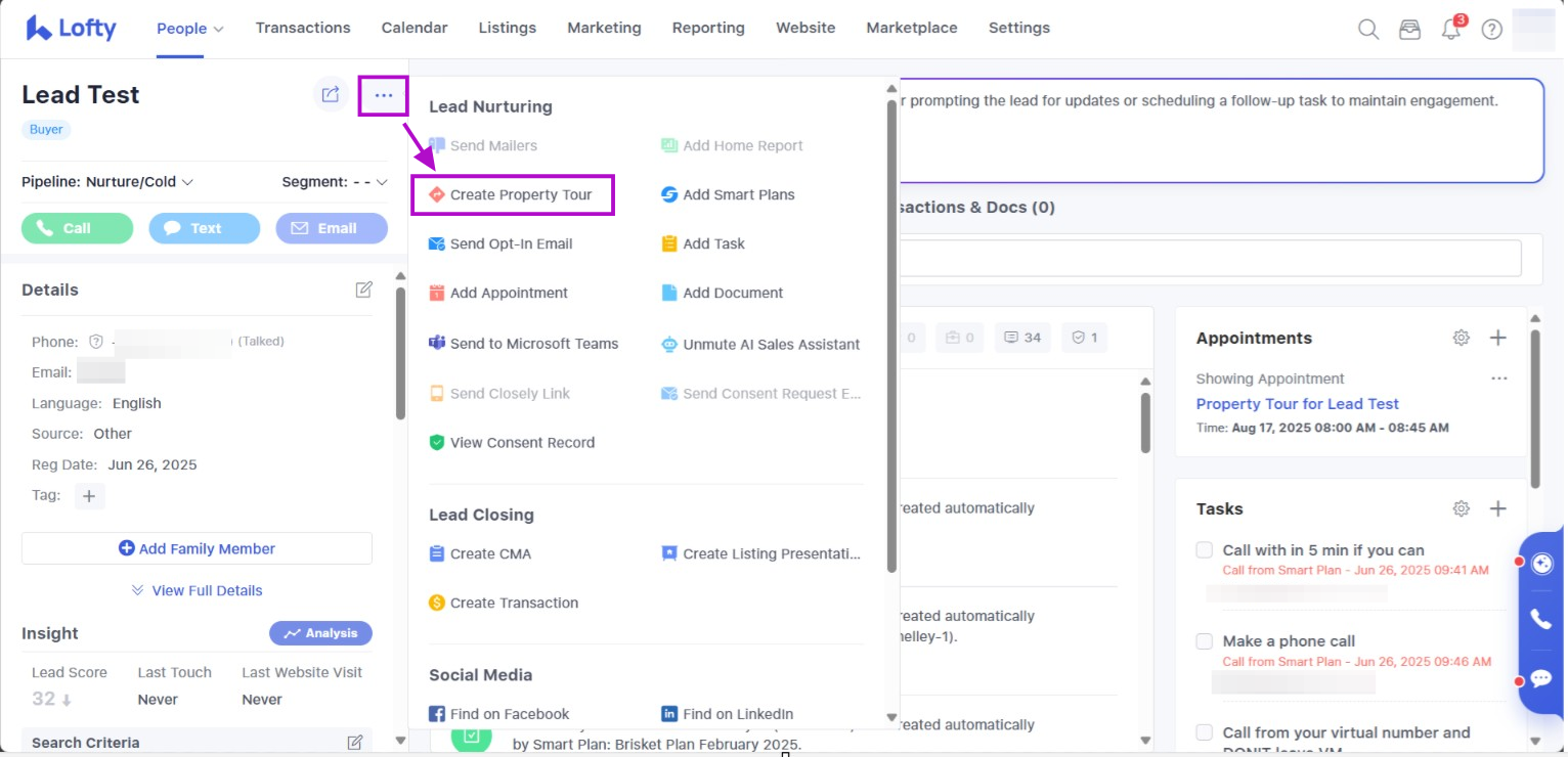 Navigate to the lead's profile and select Create Property Tour from the menu in the three-dot icon.