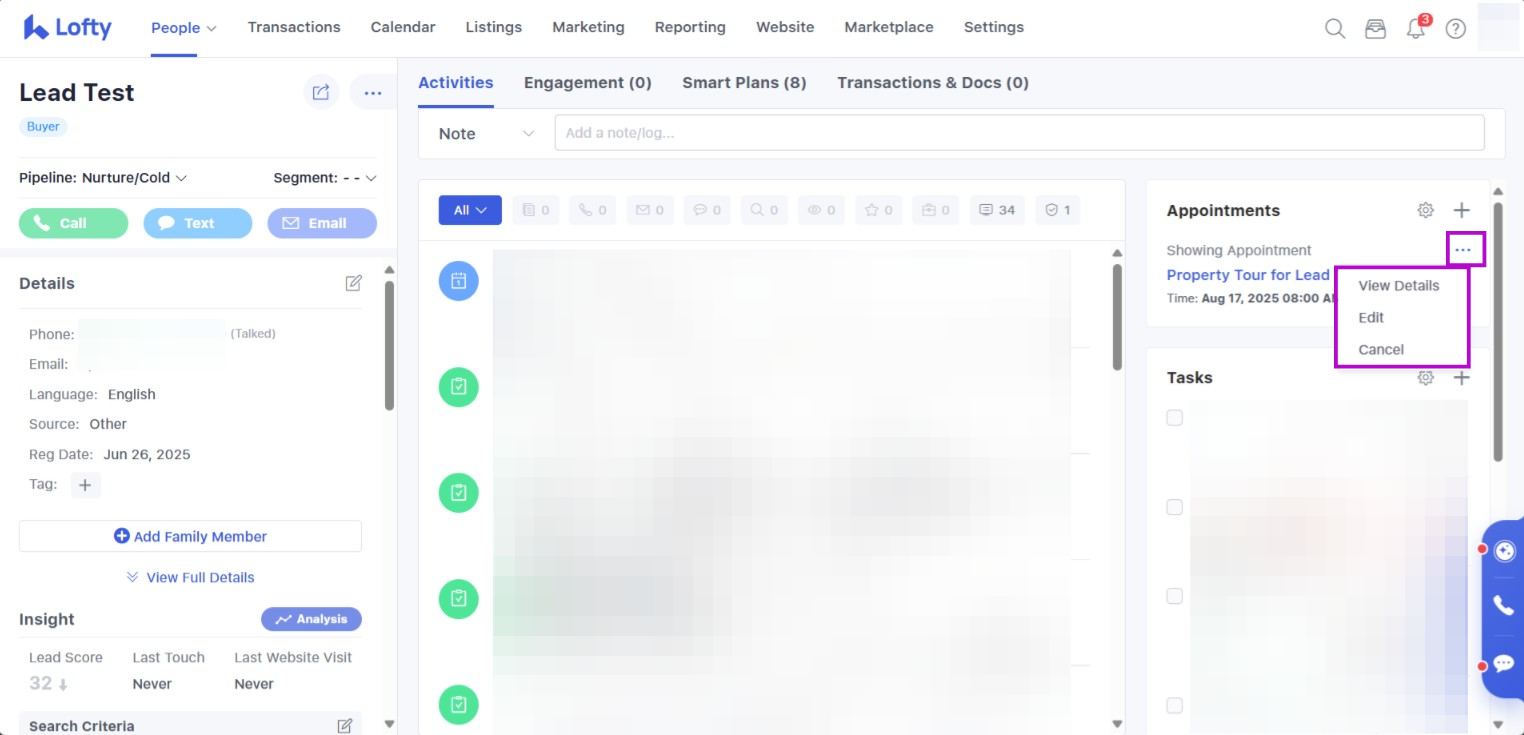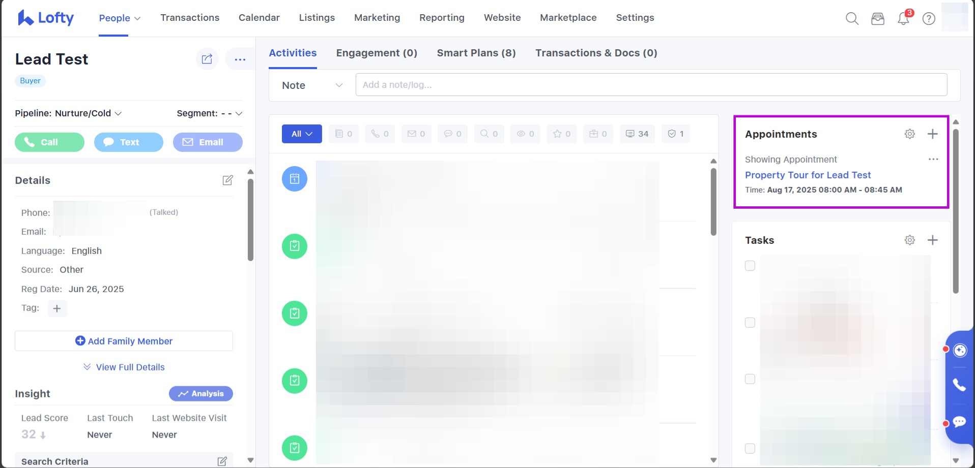 When a property tour has been scheduled with a lead, the tour will be available in the Appointments section of the lead profile.