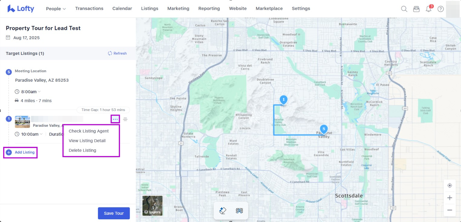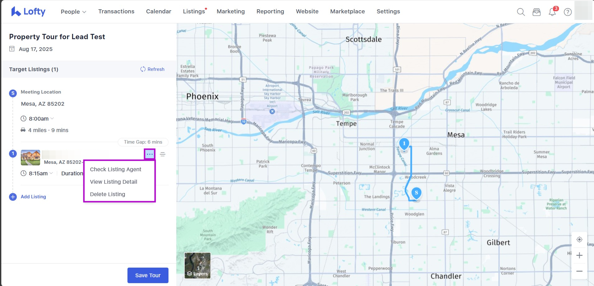Click the three dots icon to contact the listing agent, view the listing details, or delete the listing from the tour.