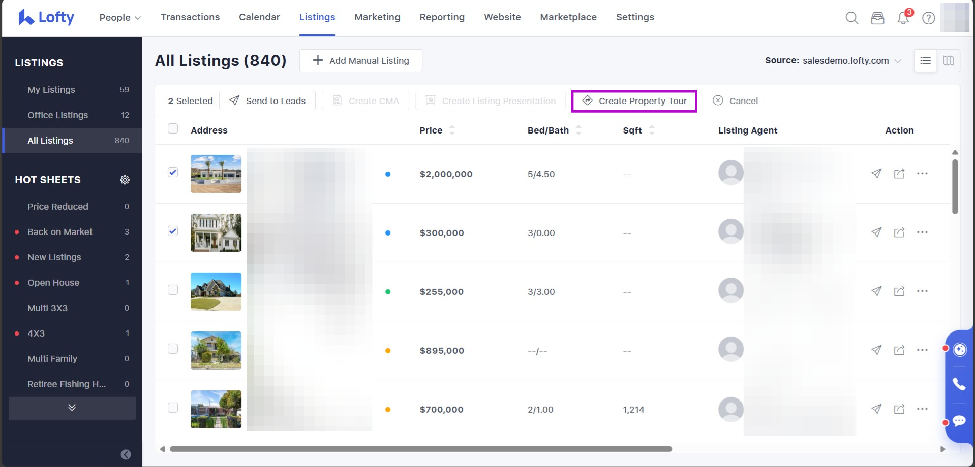 Navigate to Listings and check the box next to at least one listing. Once the box is checked, click Create Property Tour to get started.
