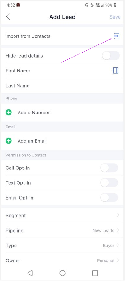 On your Add Lead page, click the Import from Contacts icon.