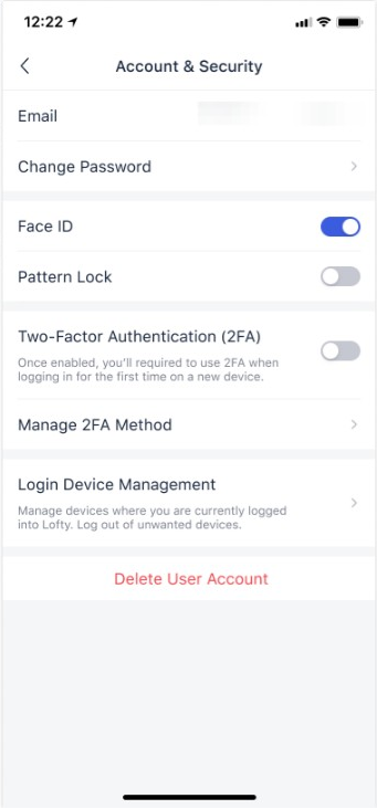 If you have not already set up FaceID on your device, there will be a pop-up that guides you through configuring FaceID. Once this is done, you can then go back to the Lofty app and turn on Face ID.
