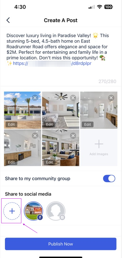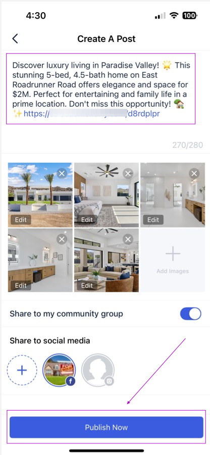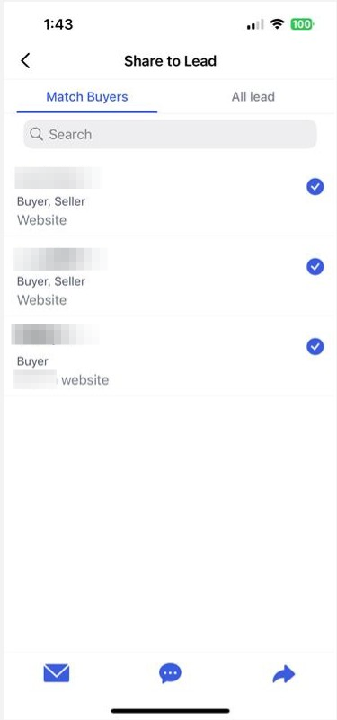 When sharing listings with a lead, you have the option to filter by leads who are Matched Buyers or by All Leads. You can also copy the URL to the listing to share on social, or send via email by clicking on the arrow in the bottom right-hand corner. Using this option will generate a short URL that is friendly for sharing.