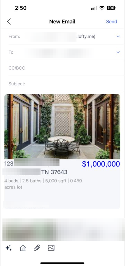 - After insertion, the listing appears as a variable on the editing page. But after sending, it will become a listing card in the email body.