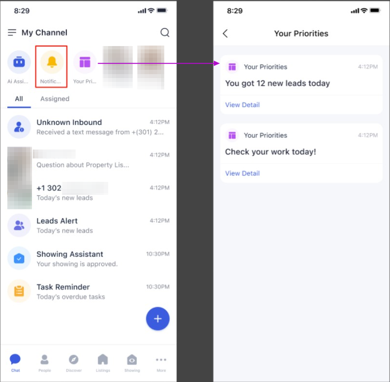 A notification chat called "Your Priorities" can be muted or pinned. Every day at 8 a.m. in your time zone, we will push a notification through the chat to guide you to go into the mobile dashboard.