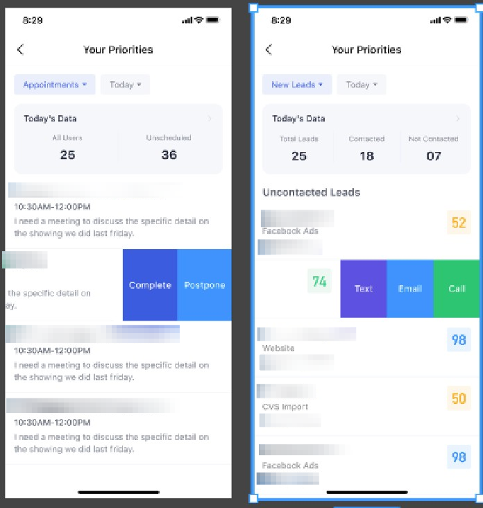 - We support new leads, opportunities, need to follow-up, tasks, transactions, appointments, and showings.