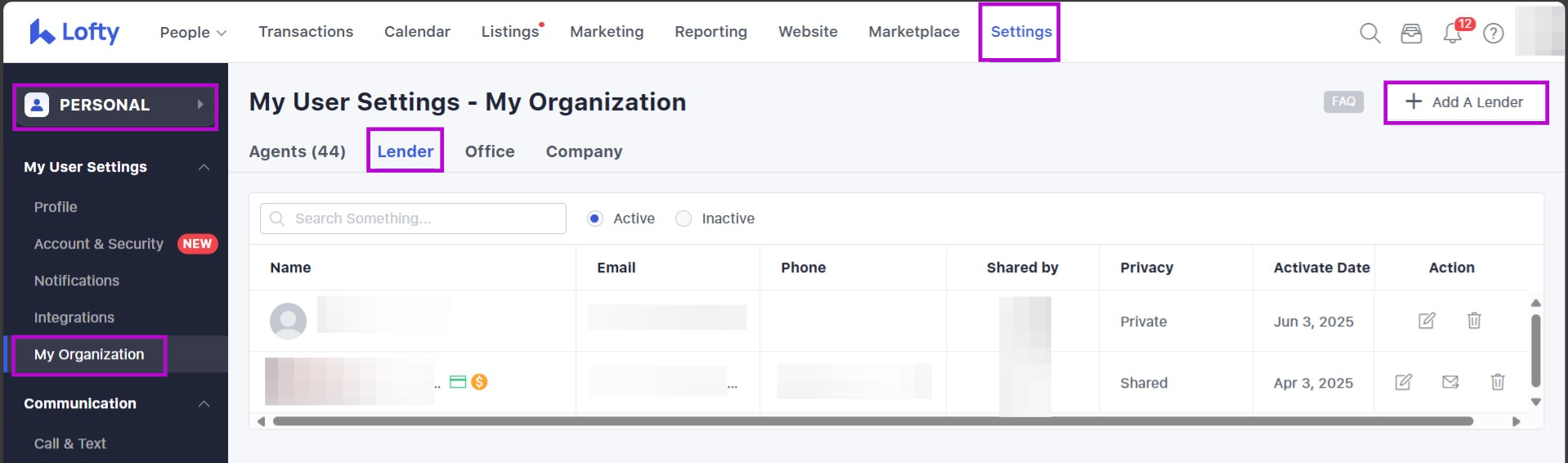 To set up cost-sharing with a lender, you must first invite the lender as a lender-type account. This invitation can be sent through the Lofty platform by navigating to Settings > Lender > + Add A Lender.