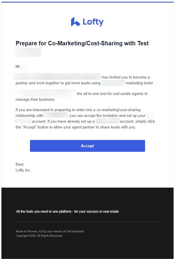 Below is a copy of the invitation that gets sent to the lender. The subject is "Prepare for Co-Marketing/Cost-Sharing with (your name)" and the email comes from Lofty (lofty@lofty-alert.com).