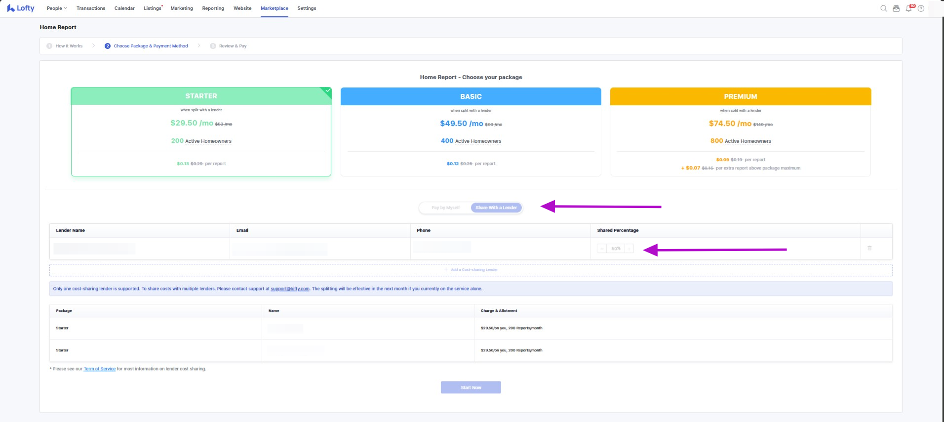 When purchasing a Home Report subscription from the Marketplace, you will have the option to select whether you would like to pay by yourself or share the cost with a Lender. If you choose to share with a Lender, you can select the percentage the cost should be split (up to 50%).
