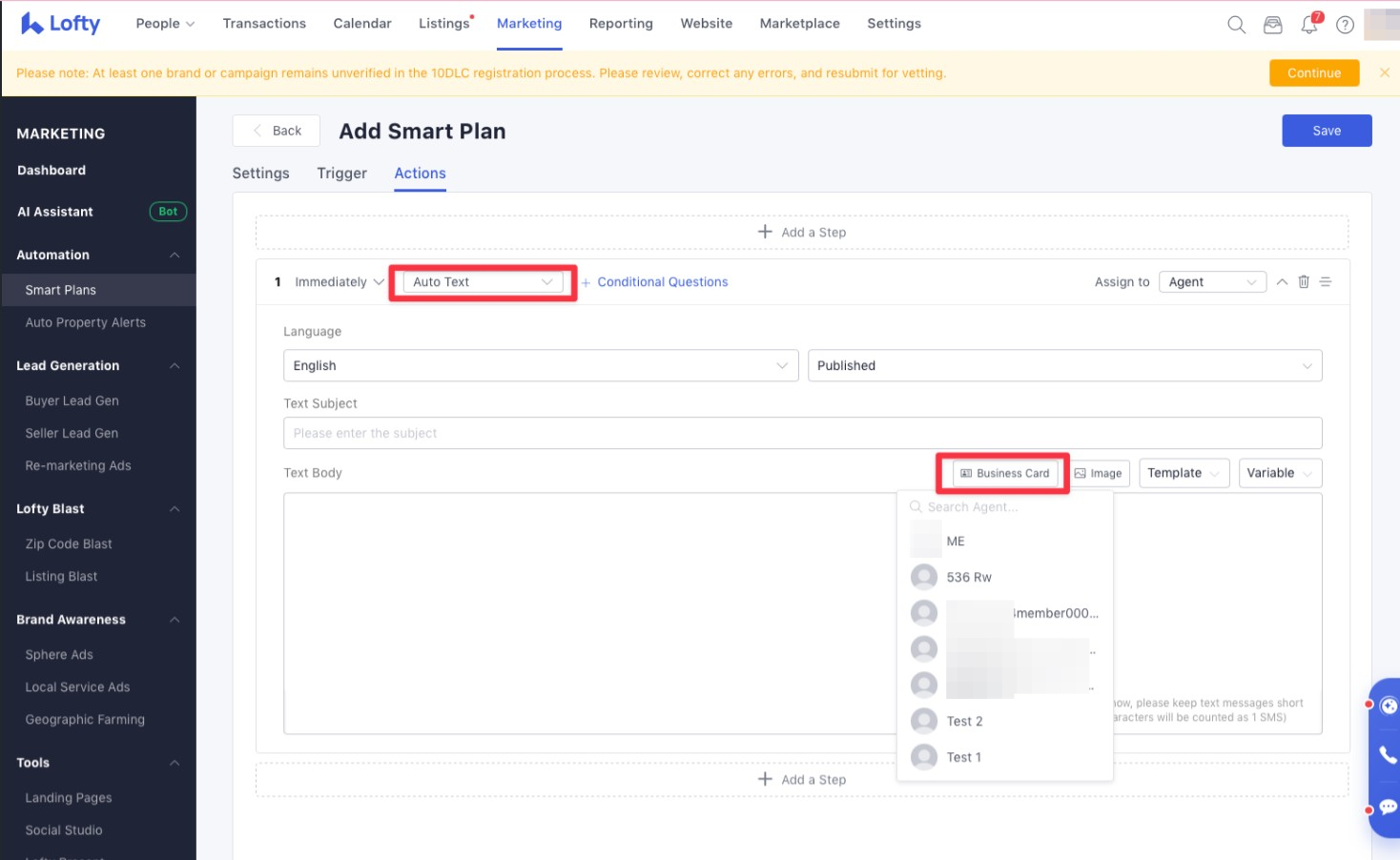 You can also add a Business Card to the smart plan (Auto Text). If the selected agent is inactive or deleted, then the smart plan will be suspended.