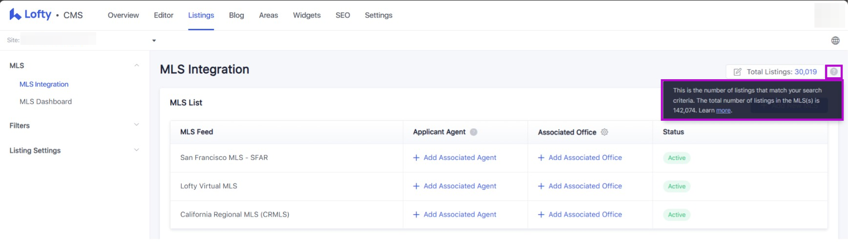 Log into Lofty, then click Website > Listings > MLS Integration.