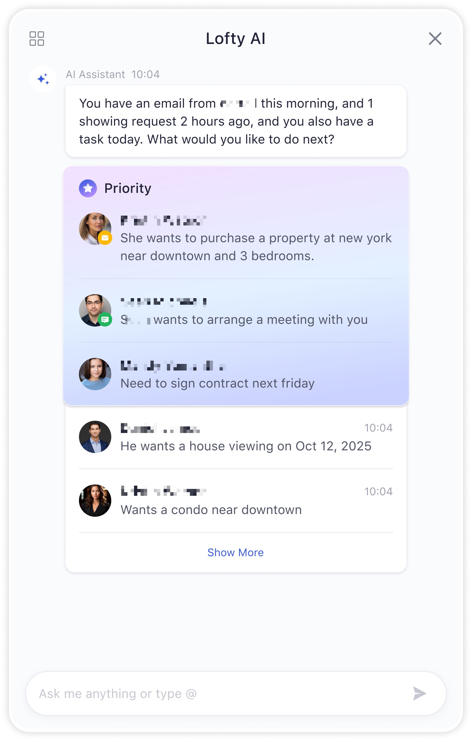 AI Assistant is Lofty's first integrated AI chatbot that is designed to help you streamline your day. AI Assistant can help you identify top-priority leads, craft engaging messages, and answer product questions, anywhere you are in Lofty.