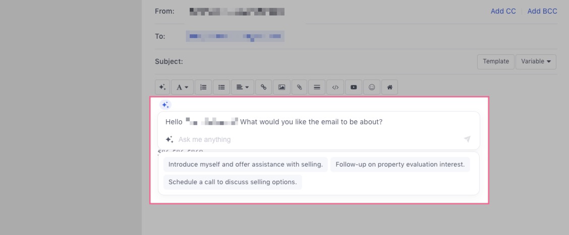 You can use the AI Assistant to draft one-off or mass texts and emails. Instead of opening your lead's profile, you can type the message and send it directly in the AI chat prompt.