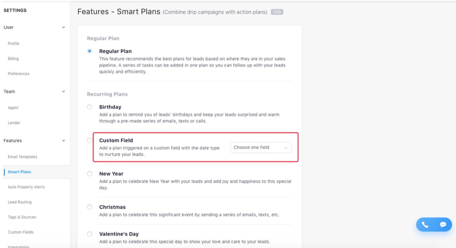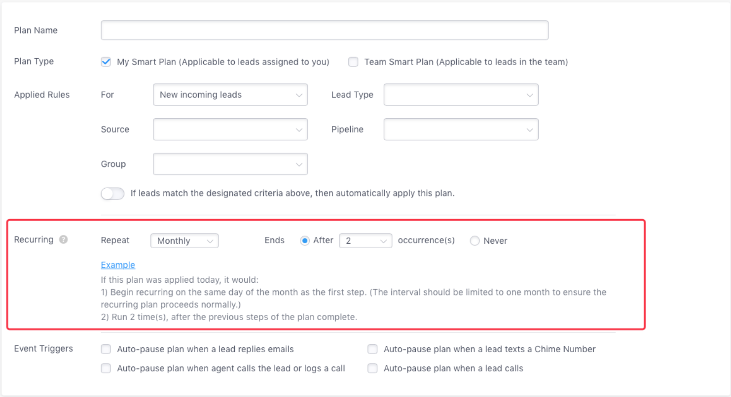 Agents can set up smart plans associated with Custom Fields (date type), like Close Date and Anniversary. This feature enables you to always apply relevant plans to leads. Additionally, you can choose to recur Yearly, Monthly and Weekly for this kind of plan.
