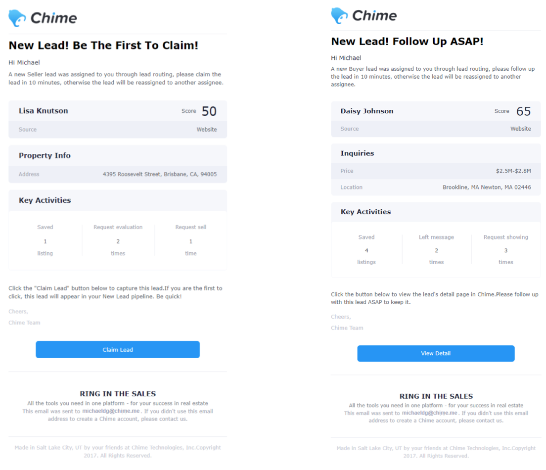 The New Lead Alert and Reassign Lead Alert Email will contain more details about this lead. You’ll see how our AI system evaluates this lead and what he has done since his date was captured.