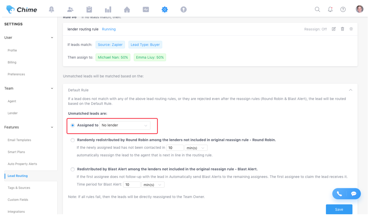 - When setting up routing rules for lenders, you are able to select “No lender” in the Default Rule.