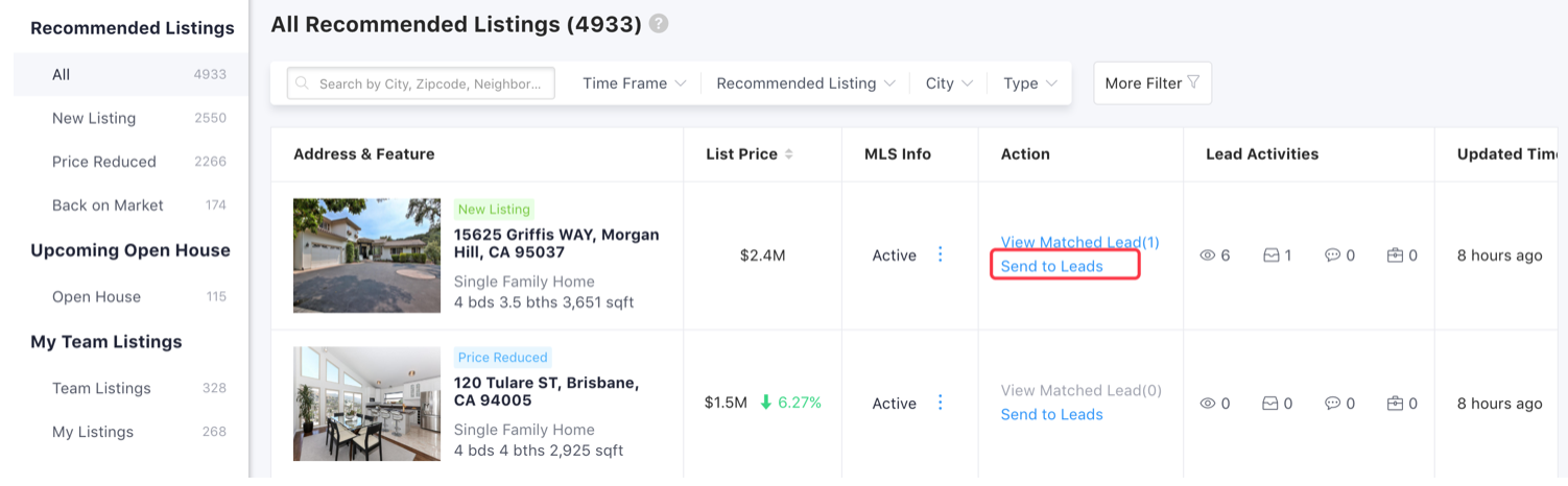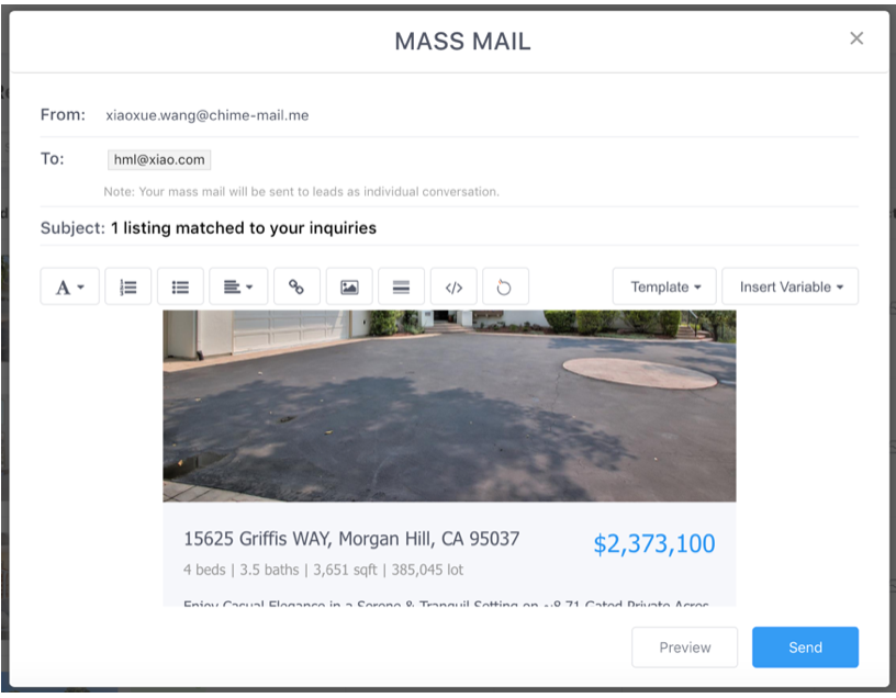 - Send listings to leads. Now, you can send any listing to a lead by clicking on Send to Leads in the Action column. Select the specific leads you want to send and then edit the content in the mass mail editor.