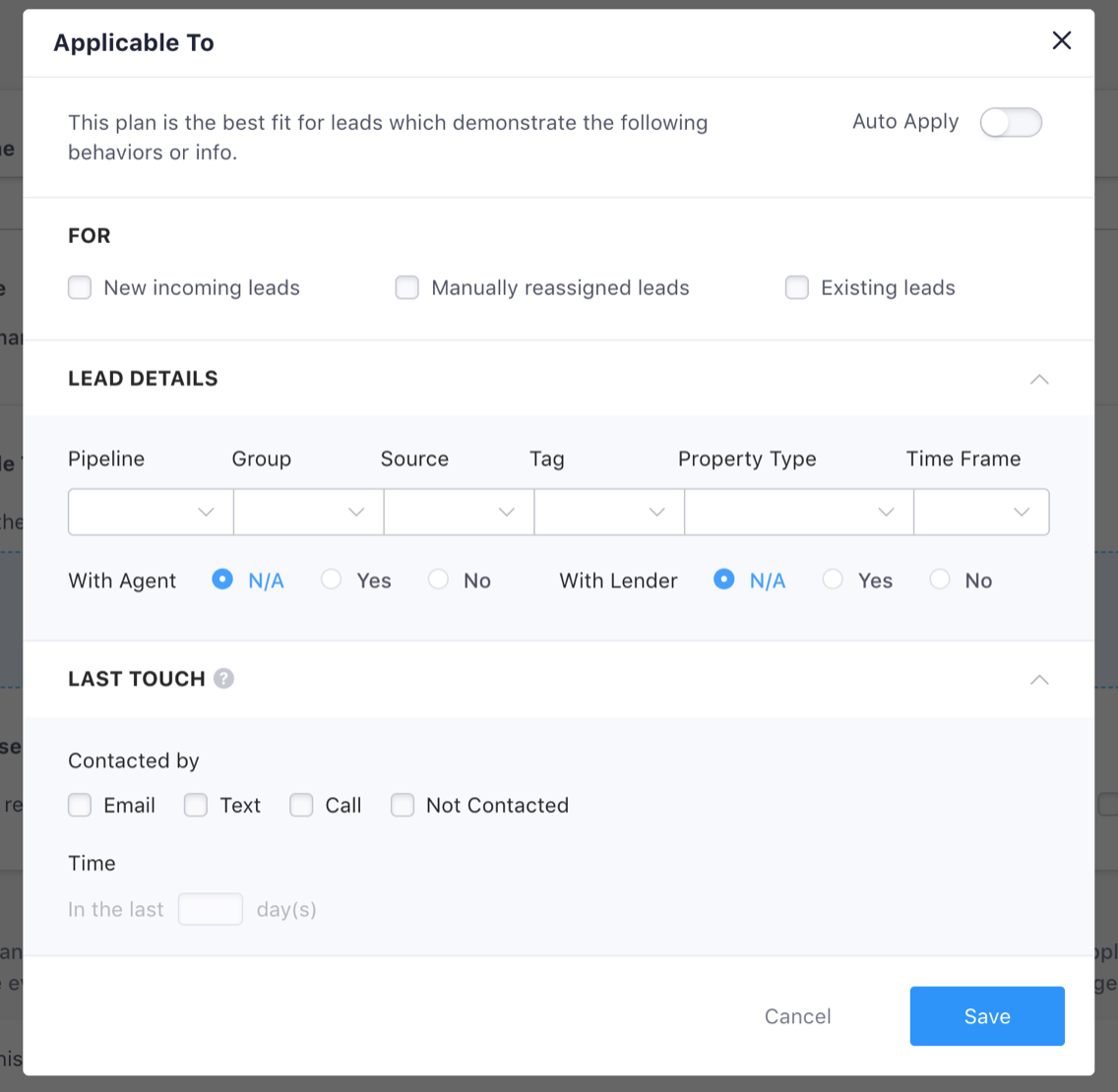 - Besides using the Segment, Source, and Pipeline criteria, workflow automations can also be set based on the Shared Tag, Property Type, Time Frame, and even Last Touch to target specific leads. With more criteria available, the Smart Plans can now better cater to leads and users can easily set up smart workflows for every situation.