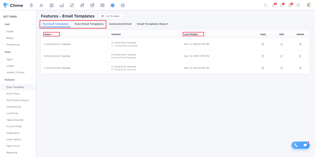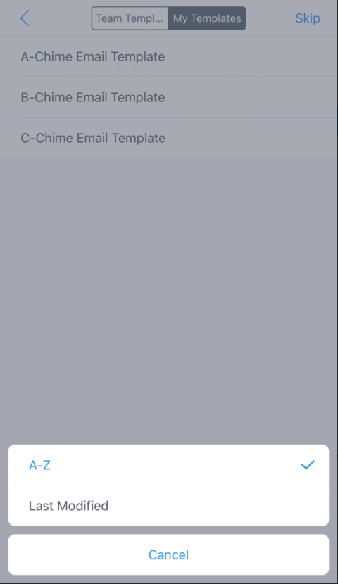 When you want to find or manage the Team & My Email Templates, you can sort them by initials or time it was last modified.