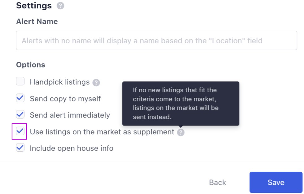 To be more specific, if you uncheck the box ”Use listings on the market as a supplement,” the alert will only include new properties available on the market and properties whose price or status changes after the Buyer Property Alert is set up. A standard Buyer Property Alert will only send out listings that match the criteria moving forward--not those that are already on the market. Unchecking this box will prevent any other listings from being added should the number of matching listings be very small.