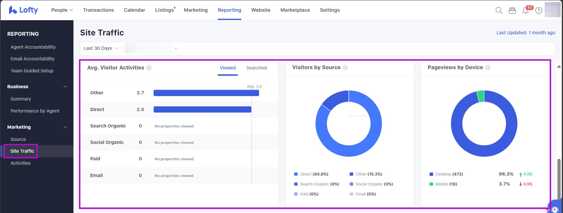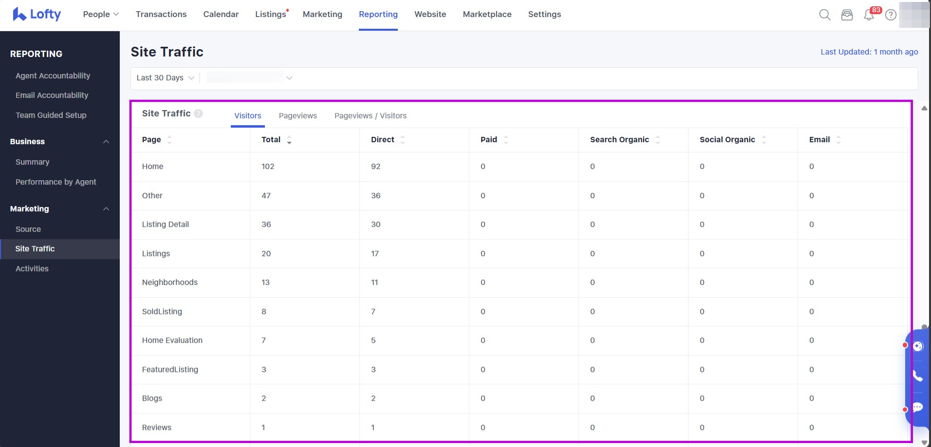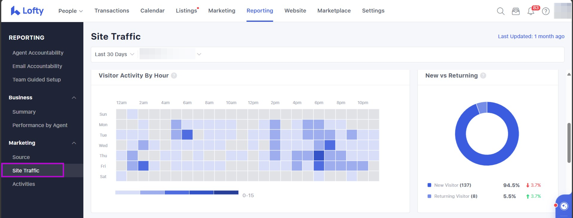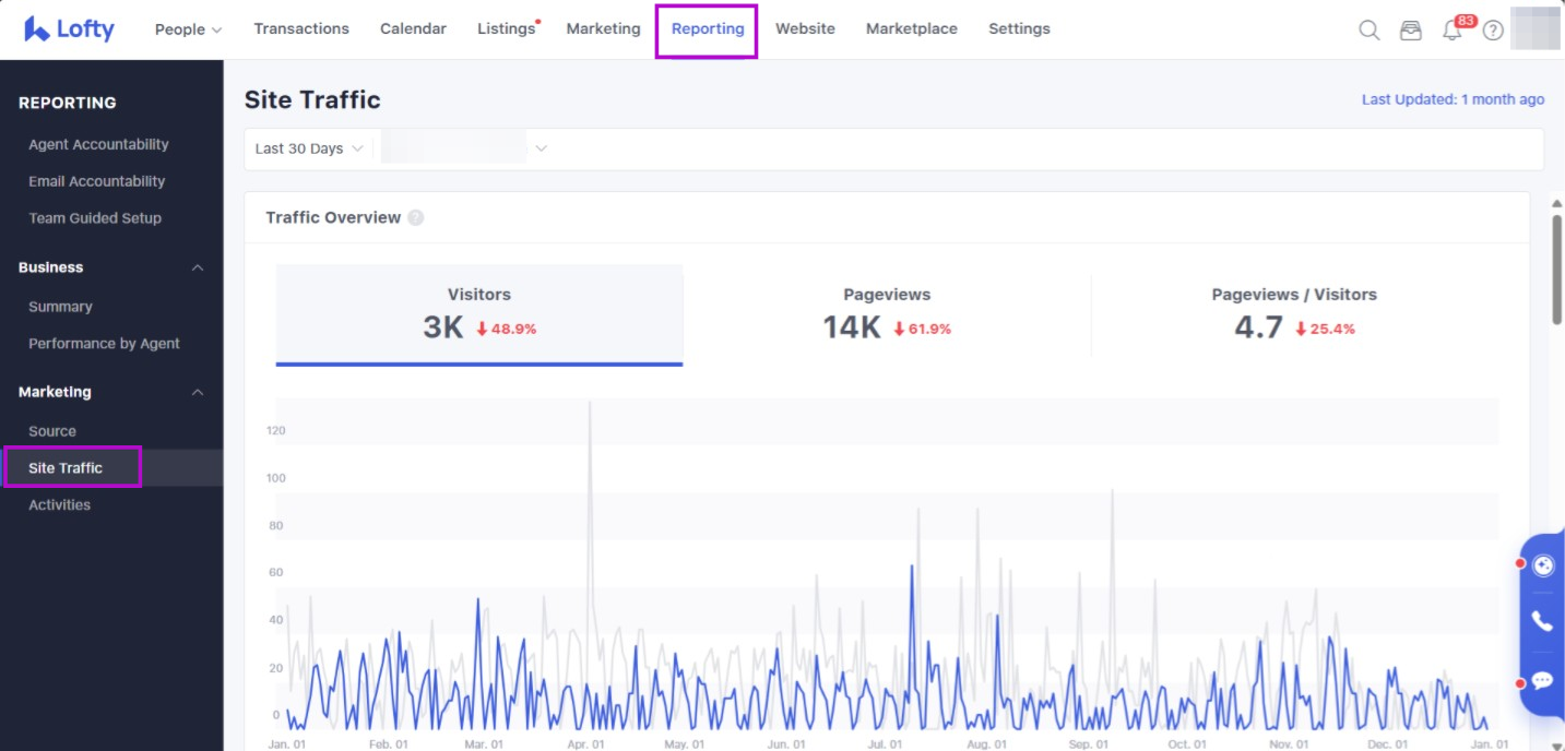 In this article, we will review how to utilize the Site Traffic Report to have an overview of your Lofty website and traffic status. The data for this report is generated by Lofty's built-in site logs. If you would like a different type of reporting data you may want to consider taking a look at our Google Analytics Integration.