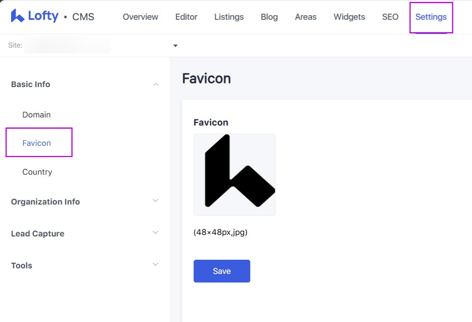 To edit this on a Lofty-built website, go to the CMS Tool > Settings > Basic Info > Favicon > Upload an image. Lofty recommends an image of 40x40px in JPG format. Once uploaded and then saved, this favicon will display for the website instead of the standard Lofty logo.
