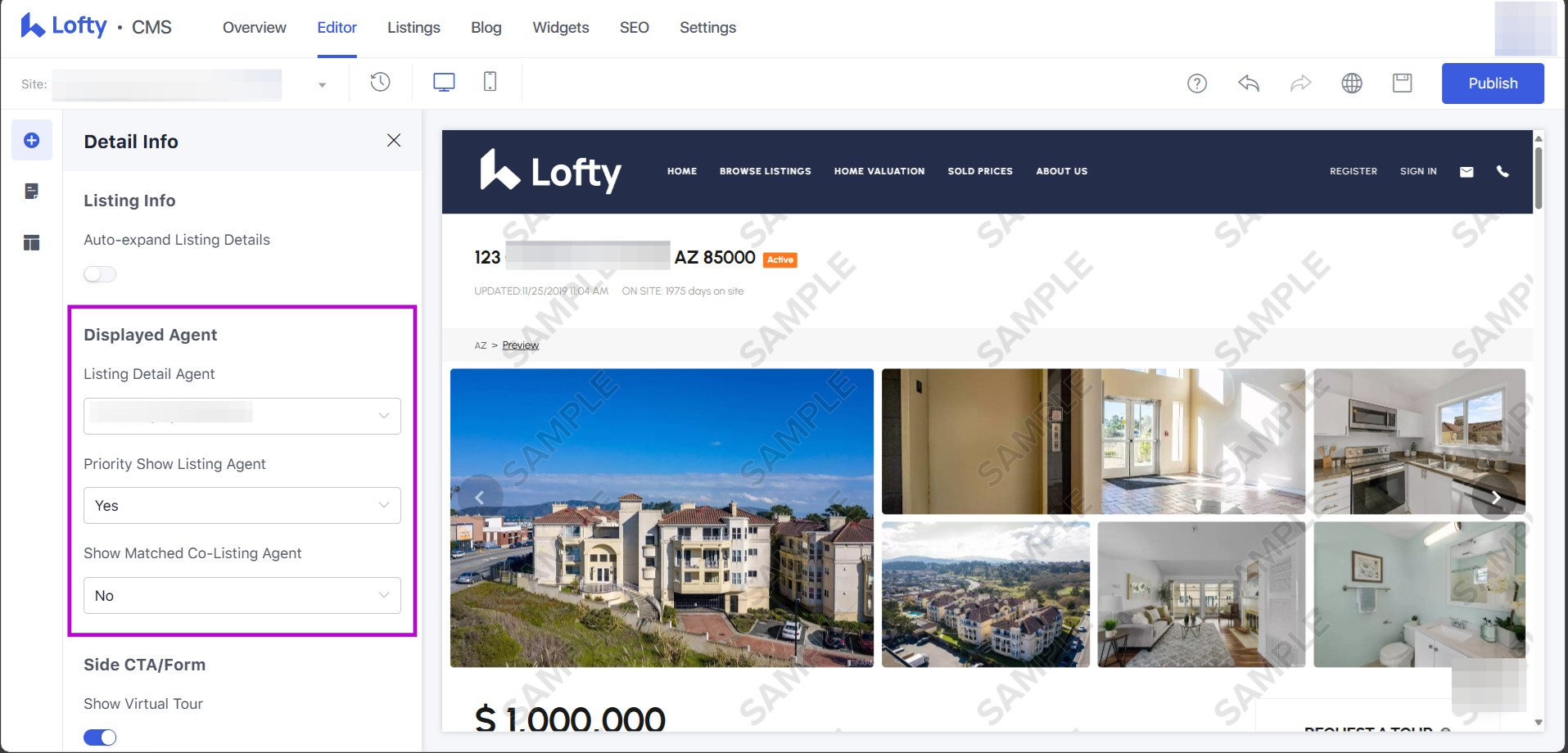 To adjust the "Displayed Agent" information, use the three available fields. The option to "Priority Show Listing Agent" will make it so that if there is a listing agent that is on the Lofty team and it is their listing, it will display their information. However, this is only for the display of the agent information or co-listing agent information, but is not related to who the lead, messages, etc. go to. Lead distribution is set up via lead routing (Agent Lead Routing Rules). This is all set up using the MLS Agent ID that is in the Lofty user's preferences under settings.