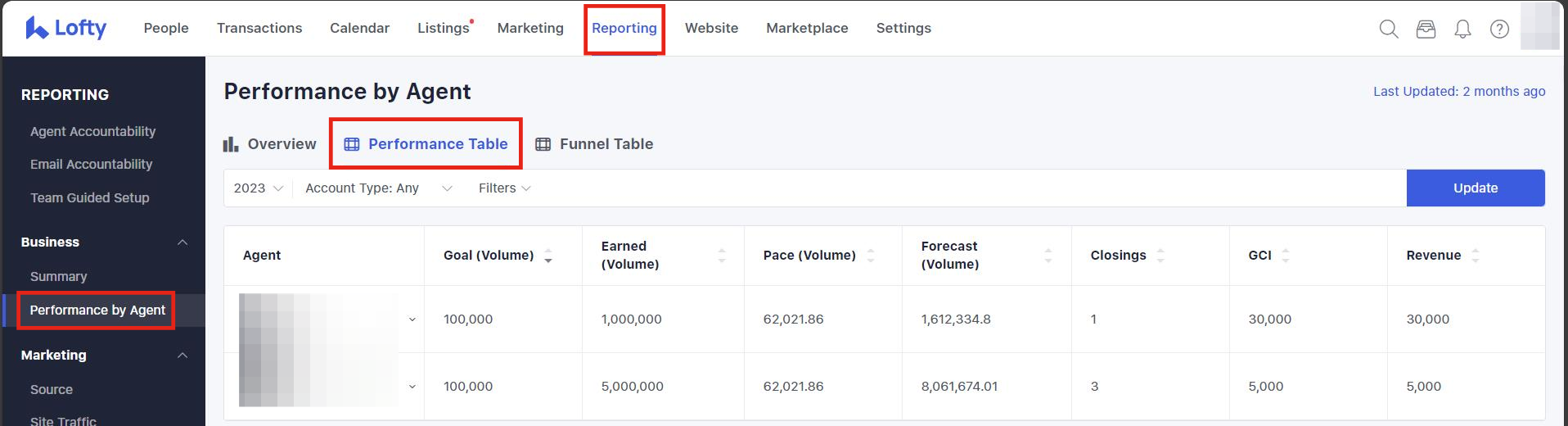 If the Team Owner/Admin wants to compare other money types, such as GCI and Revenue for each agent, he or she can also click the "Performance Table" right next to the "Overview" button to do a detailed comparison.