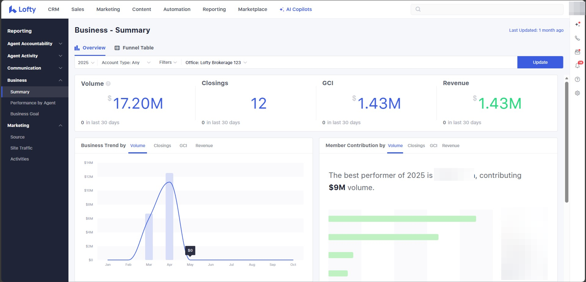 Also, the agents with the top transaction volume, Closings, GCI, or Revenue will be shown at the top of the team performance page to be viewed by all team members (under the "Summary" page) to encourage each team member.