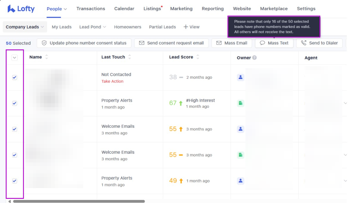 For mass text messages, the system will exclude the leads with invalid phone numbers. See the screenshot of the pop-up message below: