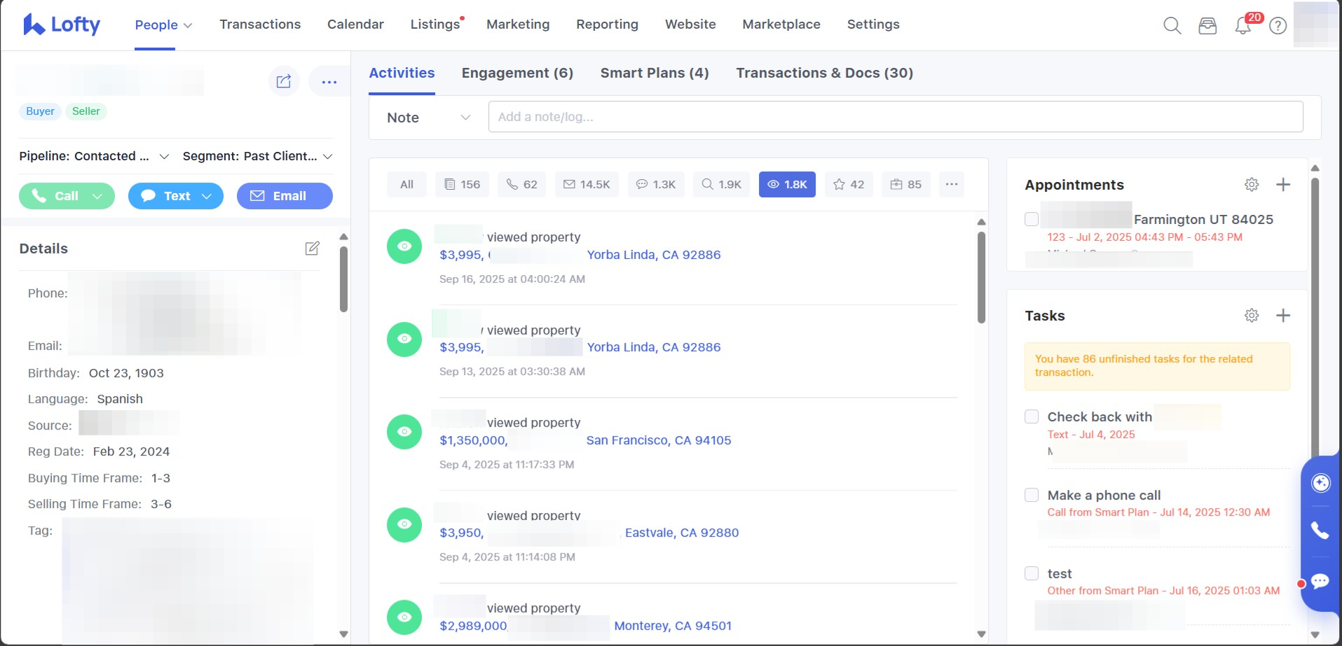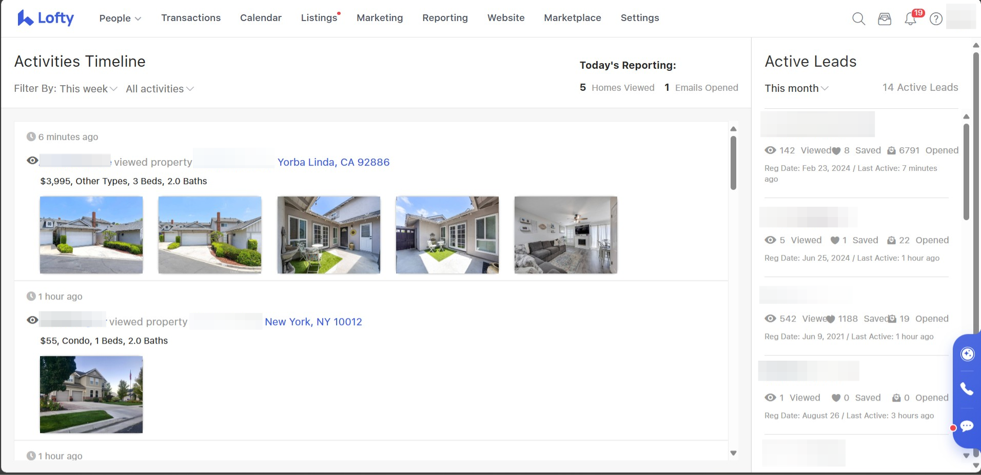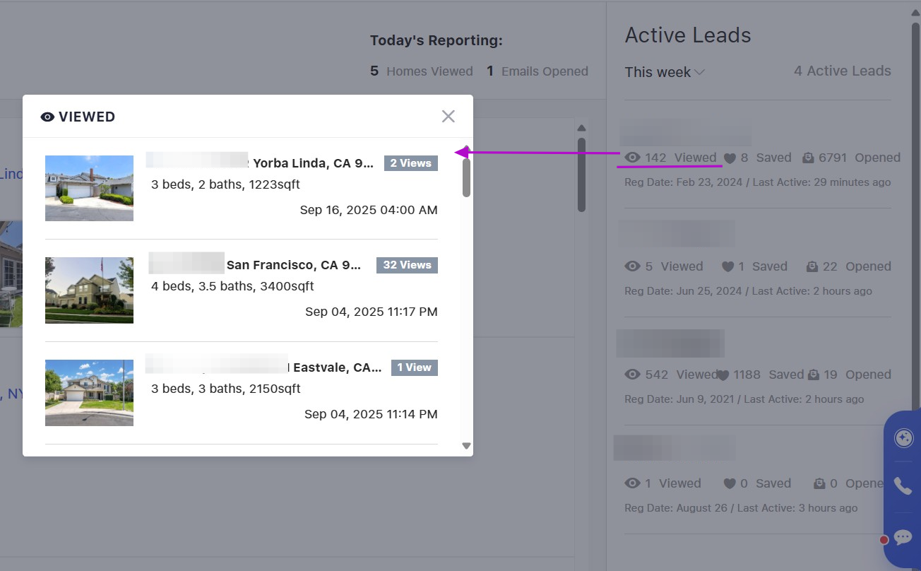 Clicking on the lead's name in this section or anywhere else on this page will take you to their lead profile. In the "Active Leads" section, you can click on the "eyeball," "heart," or "email" icons to look at the properties they have viewed or favorited or emails they have opened. If they have viewed a property multiple times, that will also be listed here.