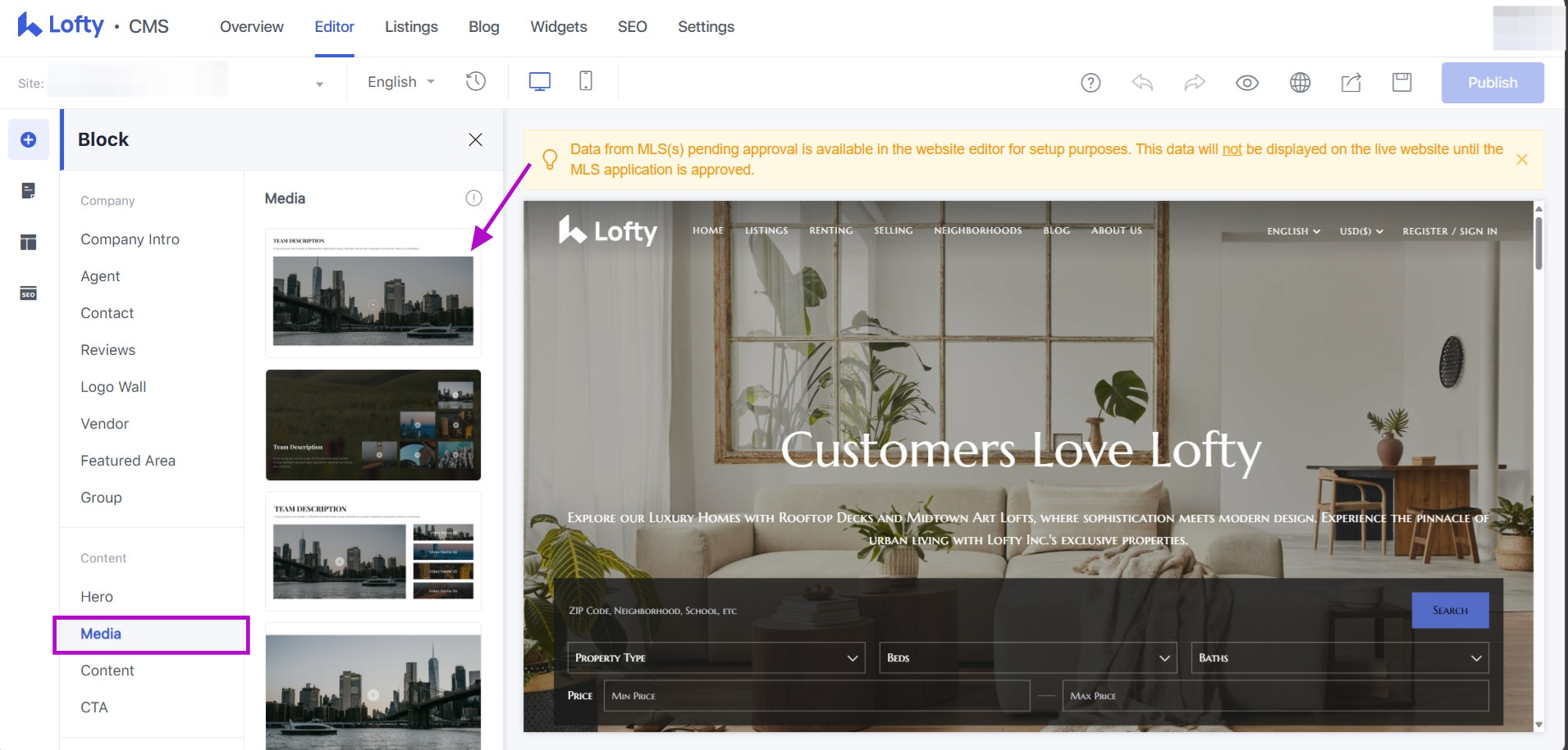 To add Media Blocks, navigate to the CMS > Page Editor > + Blocks:
