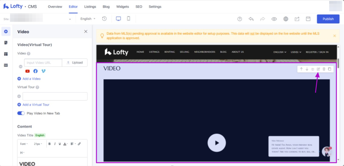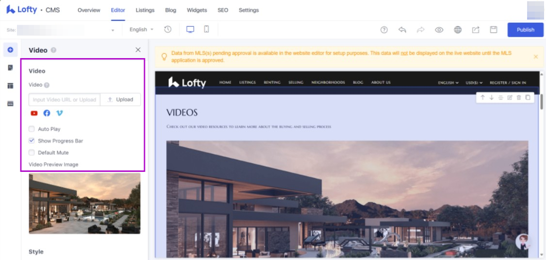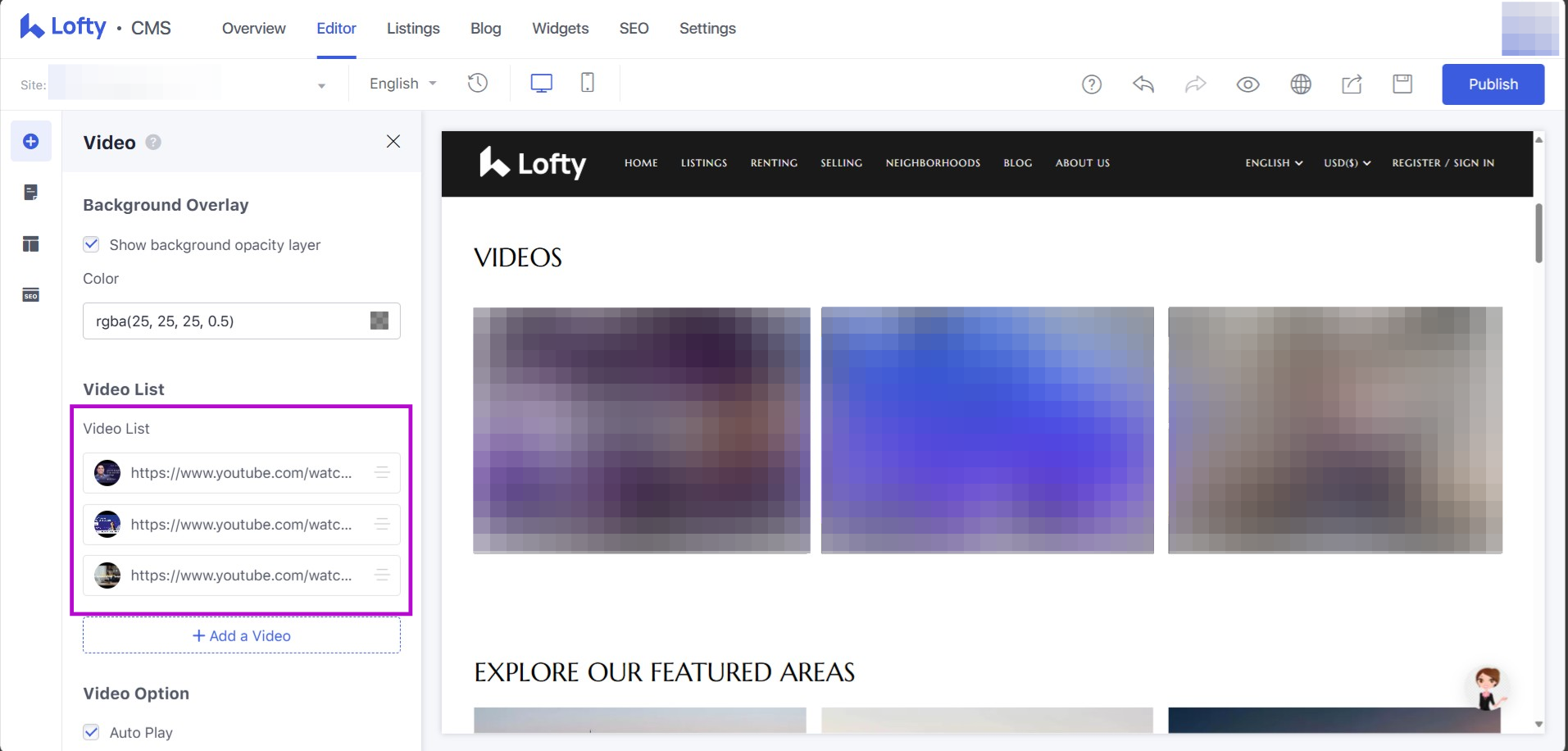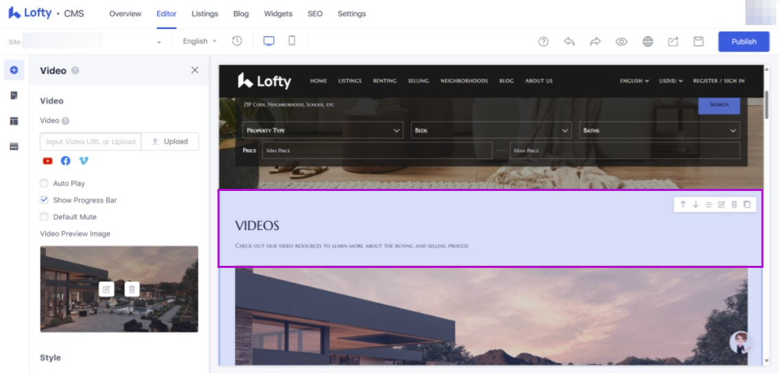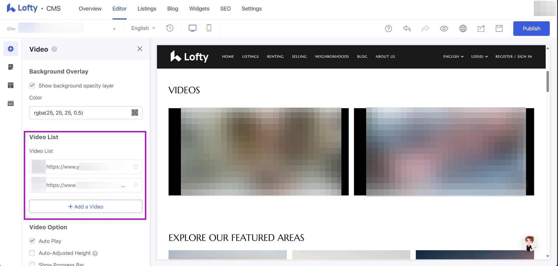 You can upload multiple videos and multiple virtual tour links using this option. You can also edit the titles of the video and virtual tour sections displayed on the site. The background color can also be adjusted.