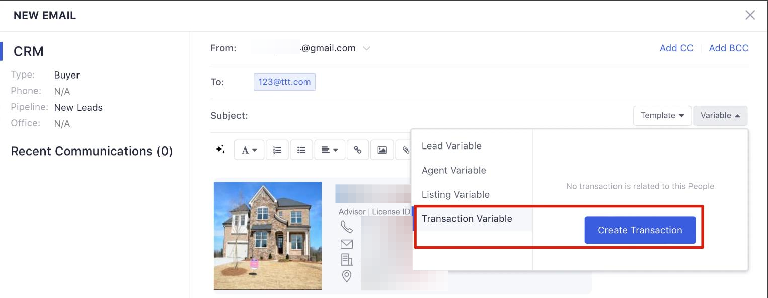 When sending an email to a single lead from any entry point, and lead has no transaction. You can create a new transaction for the lead, and the variables from the newly created transaction will be displayed.