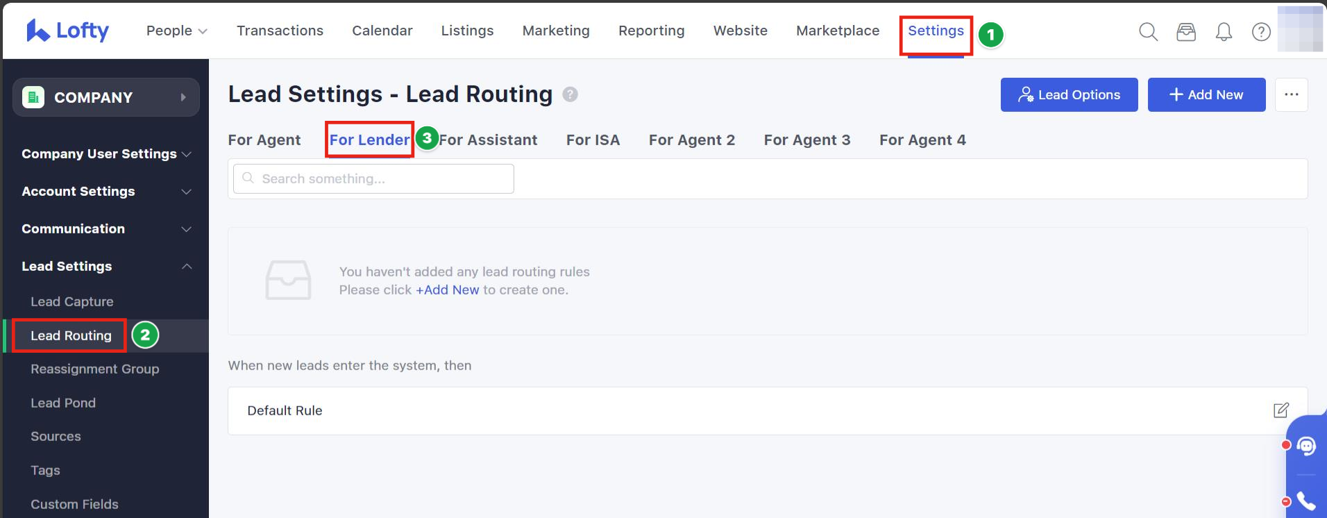Navigate to Settings > Lead Routing > For Lender. Lead routing rules can be created for any lender partners in this section. For more information on how to set up lead routing rules, please see Lead Routing Rules.