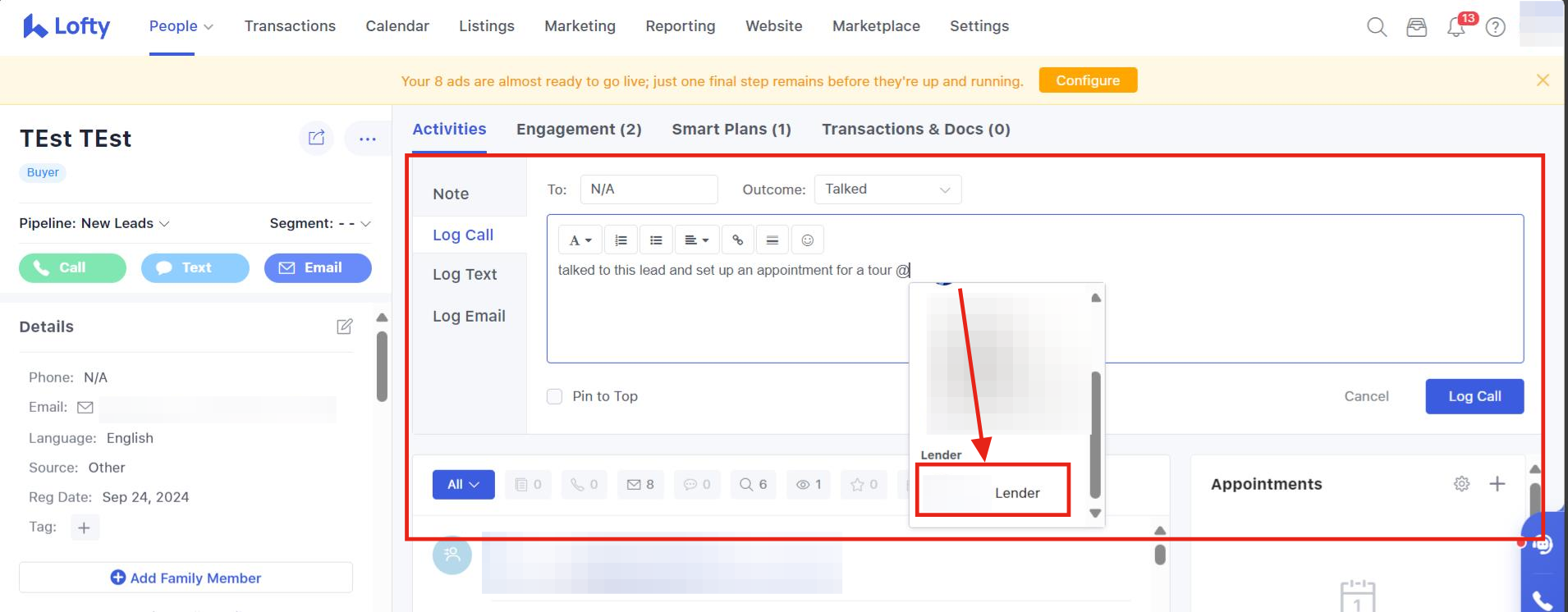 For example, if the real estate agent wants to share a note with the lender, the agent can search for the lead profile where the lender is listed in the Assigned To section (bottom-left) and then add a note while also @tagging them:
