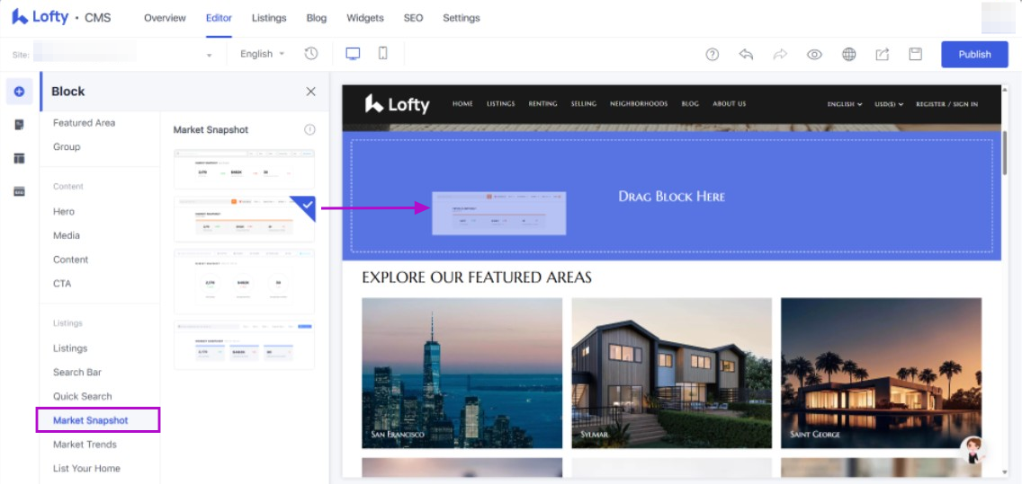 Find the Market Snapshot block, choose the style that you would like to use, and drag the block to the right side of the page where you would like to add it: