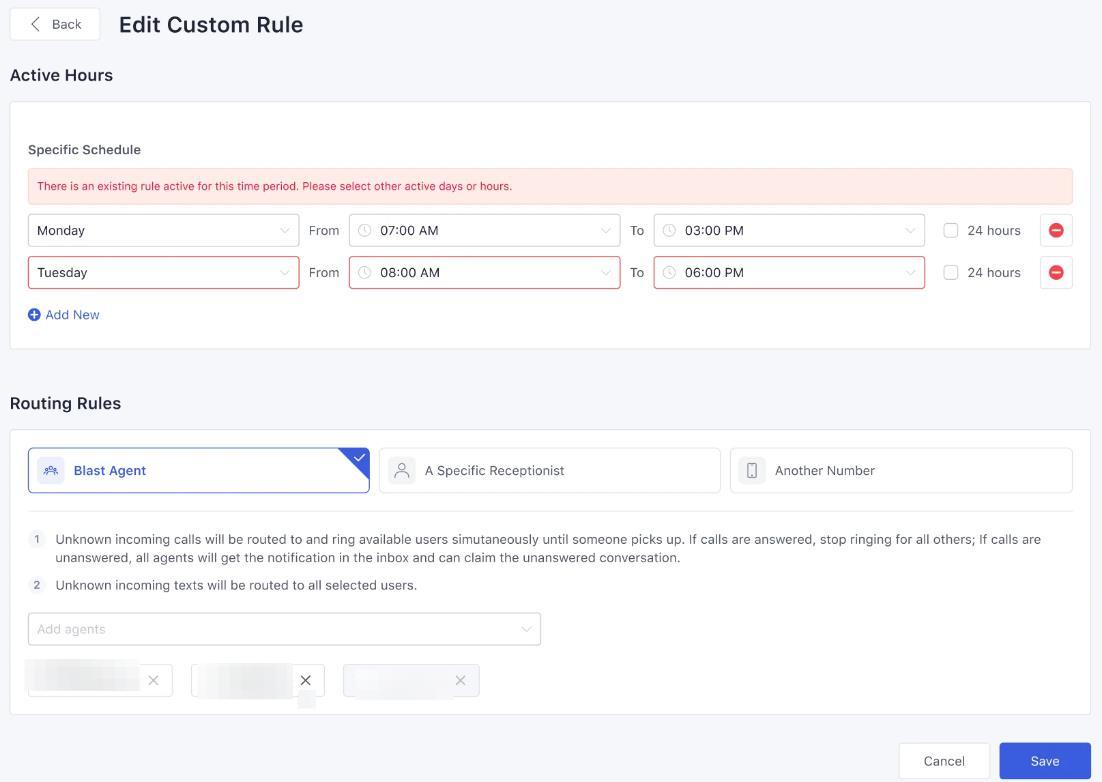 Company Virtual Number and Office Number support customized routing rules for unknown inbound calls and texts. You can add up to 10 custom rules. Working priority: custom→default.