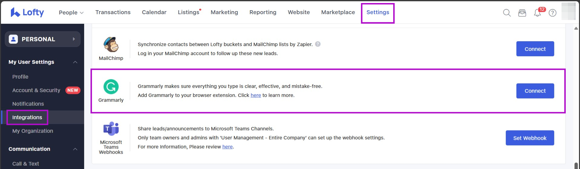 First, log in to Lofty CRM and navigate to Settings > Features > Integrations. Scroll down to the Independent Integration section, located near the bottom of the page. Click the Connect button, then you will be led to the Grammarly website.